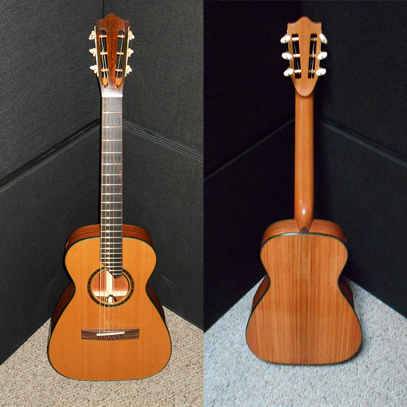 This is a guitar Josh and I have talked about building for quite some time. I wanted a 3/4 size guitar that could be tuned standard or up a third as a Terz. I couldn't be happier with the end result. This guitar is so much fun to play. The voice is unlike any I have ever heard. I have never been a fan of capos, simply because they tend to soak up too much tone. This allows me to have that chimey bell-like tone without sacrificing any sustain. This guitar rings forever and ever and ever!